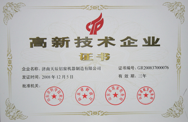 ??? 濟南高新區(qū)管委會召開了高新區(qū)2008年首批高新技術(shù)企業(yè)授牌大會,并轉(zhuǎn)發(fā)了省科技廳、財政廳、省國稅局、省地稅局的認定的通知,向區(qū)內(nèi)首批高新技術(shù)企業(yè)頒發(fā)了高新技術(shù)企業(yè)證書和銅牌。天辰鋁機公司被認定位山東省2008年第一批高新技術(shù)企業(yè)。